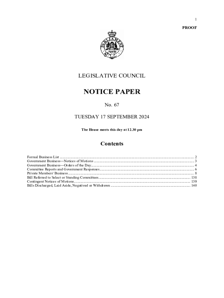 1PROOFLEGISLATIVE COUNCILNOTICE PAPER No. 67 TUESDAY 17 SEPTEMBER 2024 The House meets this day at 12.30 contents Formal Business List ..............................................................................................................................................