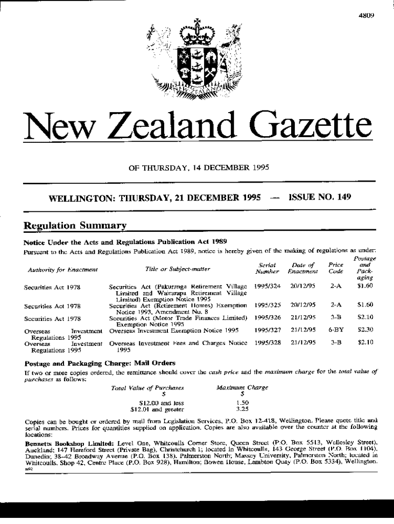 4809New Zealand Gazette OF THURSDAY, 14 DECEMBER 1995WELLINGTON : THURSDAY, 21 DECEMBER 1995 ISSUE NO. 149 Regulation Summary Notice Under the Acts and Regulations Publication Act 1989 Pursuant to