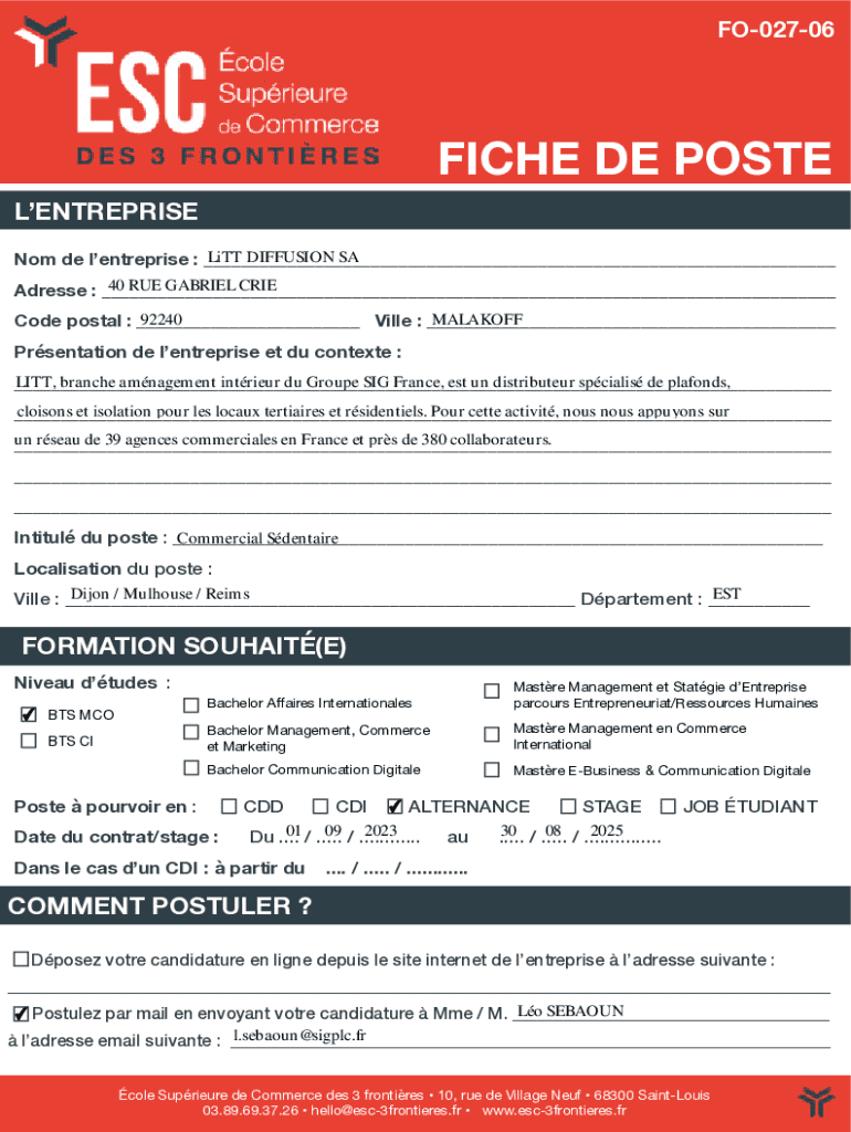 FO02706FICHE DE POSTELENTREPRISELiTT DIFFUSION SA Nom de lentreprise : ___ 40 RUE GABRIEL CRIE Adresse : ___ 92240 MALAKOFF Code postal : ___ Ville : ___Prsentation de lentreprise et du contexte :