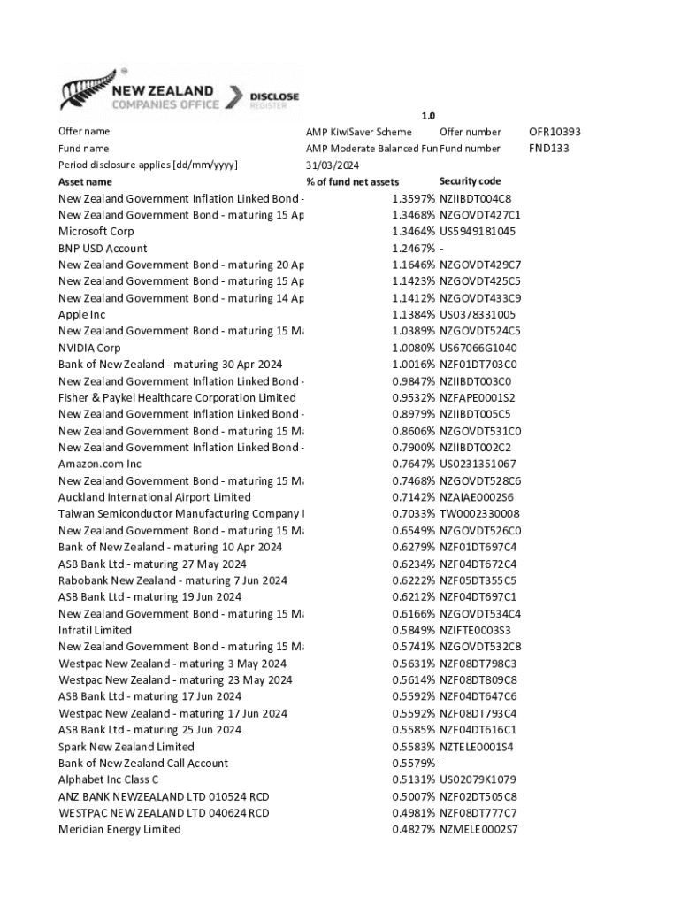 DISCLOSE REGISTER FULL PORTFOLIO HOLDINGS Offer name Fund name Period disclosure applies [dd/mm/YYY] Asset name1.0 AMP KiwiS aver Scheme Offer number AMP Moderate Balanced Funding number 31/03/2024