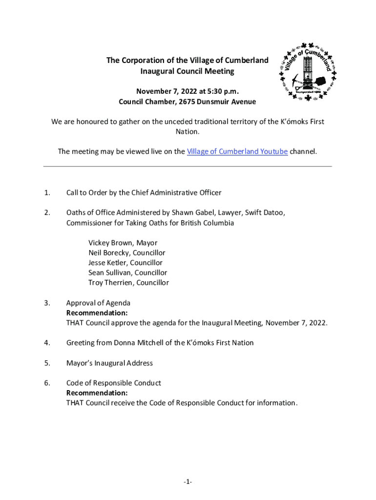 The Corporation of the Village of Cumberland Inaugural Council Meeting November 7, 2022 at 5:30 p.m. Council Chamber, 2675 Dunsmuir Avenue We are honoured to gather on the unceded traditional territory