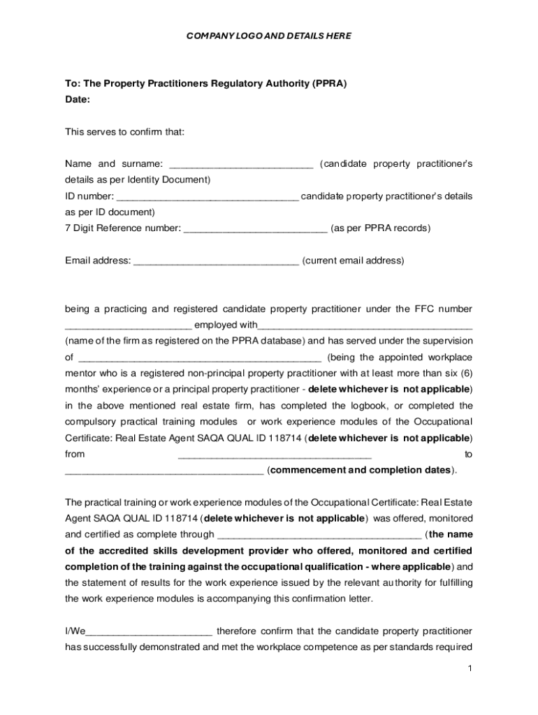 COMPANY LOGO AND DETAILS Hereto: The Property Practitioners Regulatory Authority (PRA) Date:This serves to confirm that: Name and surname: ___ (candidate property practitioners details as per Identity