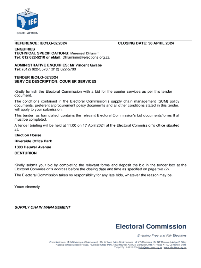 REFERENCE: IEC/LG02/2024CLOSING DATE: 30 APRIL 2024ENQUIRIES TECHNICAL SPECIFICATIONS: Yemeni Blaming Tel: 012 6225210 or email: Dhlaminim@elections.org.za ADMINISTRATIVE Inquiries: Mr Vincent Wave