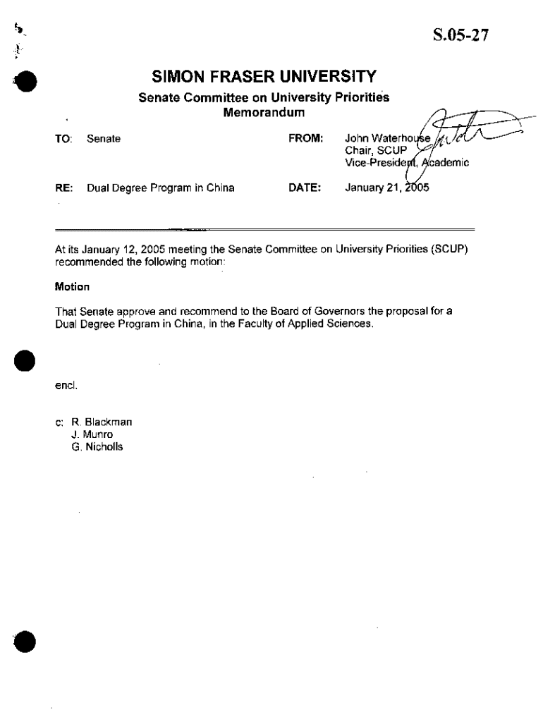 S.0527 SIMON FRASER UNIVERSITY Senate Committee on University Priorities Memorandum TO: SenateFROM:John Water Chair, SCU VicePresidRE: Dual Degree Program in ChinaDATE:January 21,At its January 12,