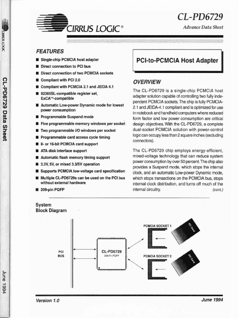 CLPD6729 Advance Data SheetFEATURESorI\"\'tJC0\')Singlechip PCMCIA host adapterDirect connection to PCI busDirect connection of two PCMCIA socketsCompliant with PCI 2.0Compliant with PCMCIA 2.1 and