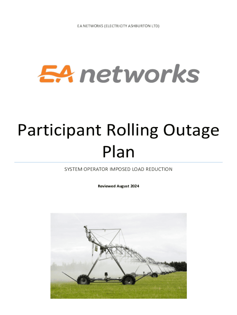 EA NETWORKS (ELECTRICITY ASHBURN LTD)Participant Rolling Outage Plan SYSTEM OPERATOR IMPOSED LOAD REDUCTION Reviewed August 2024Contents Disclaimer..........................................................................................................................................................................