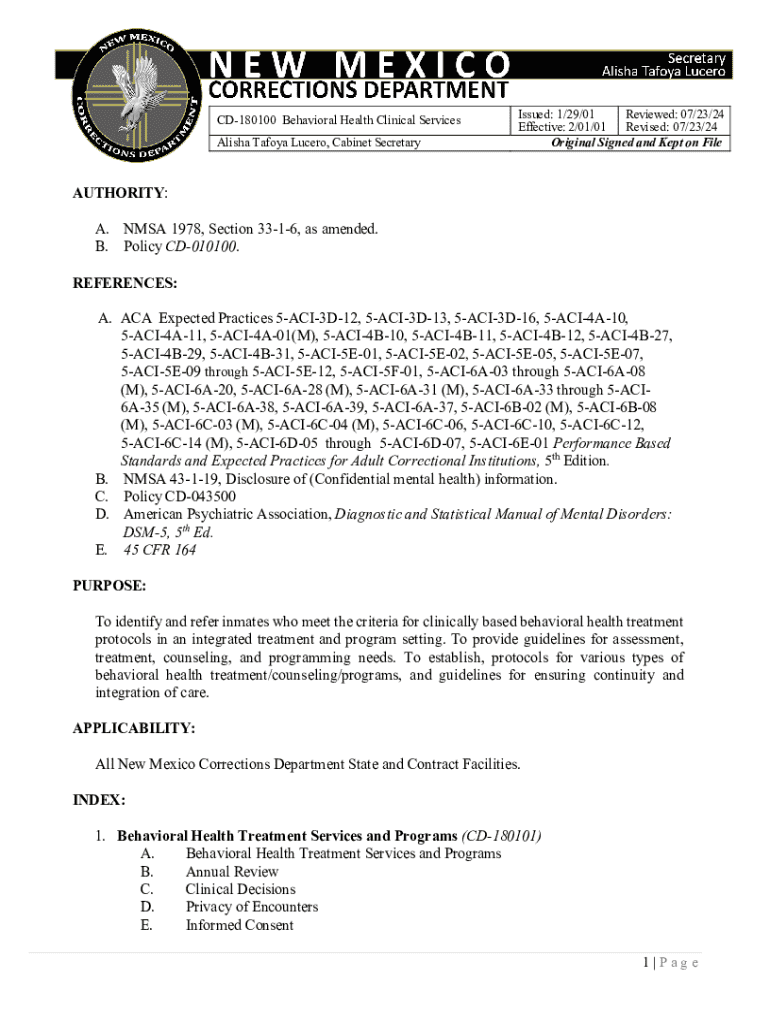This document outlines behavioral health clinical services and treatment protocols for the New Mexico Corrections Department, ensuring comprehensive care for inmates.