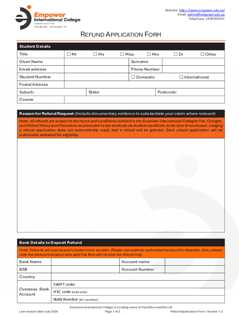 Telephone: 1300 000 REFUND APPLICATION FORM