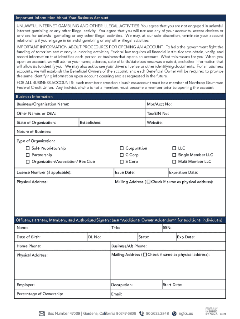 Complete the 2023 Business Account Application Packet for Northrop Grumman Federal Credit Union to expedite your business account opening.