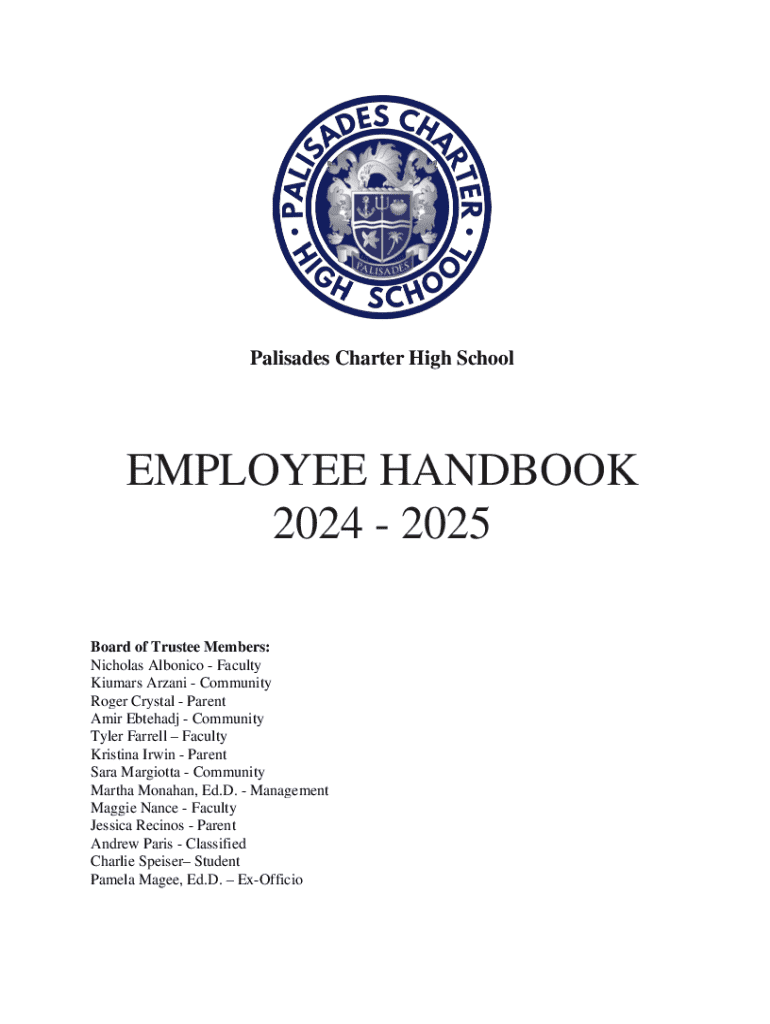 Palisades Charter High SchoolEMPLOYEE HANDBOOK 2024 2025 Board of Trustee Members: Nicholas Antonio Faculty Kumar Armani Community Roger Crystal Parent Amir Etihad Community Tyler Farrell Faculty