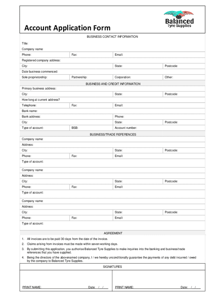 Account Application Form BUSINESS CONTACT INFORMATION Title: Company name: Phone:Fax:Email:Registered company address: City:State:Postcode:Corporation:Other:Date business commenced: Sole proprietorship:Partnership:BUSINESS