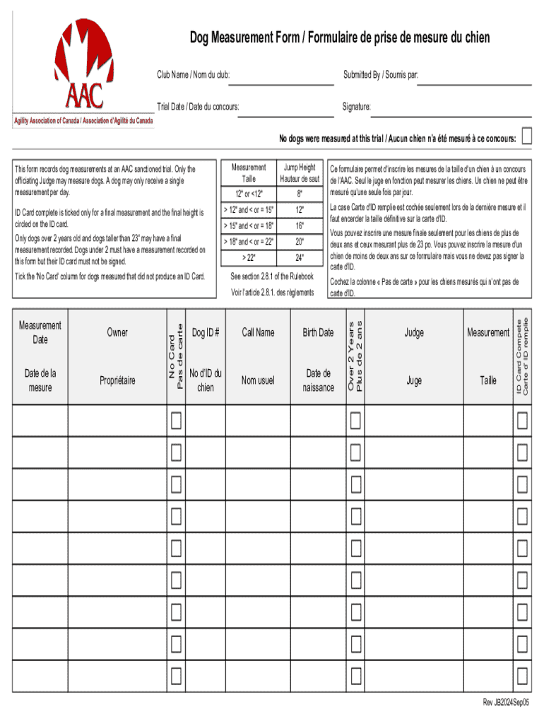Dog Measurement Form / Formulaire de prise de mesure du chien Club Name / Nom du club:Submitted By / Soumis par:Trial Date / Date du concours:Signature: No dogs were measured at this trial / Aucun
