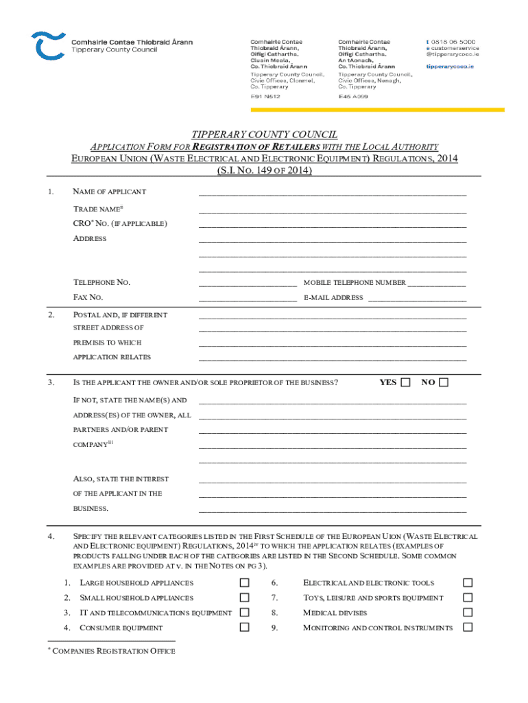 Complete this application form to register as a retailer under the EU Waste Electrical and Electronic Equipment Regulations 2014 for compliance.