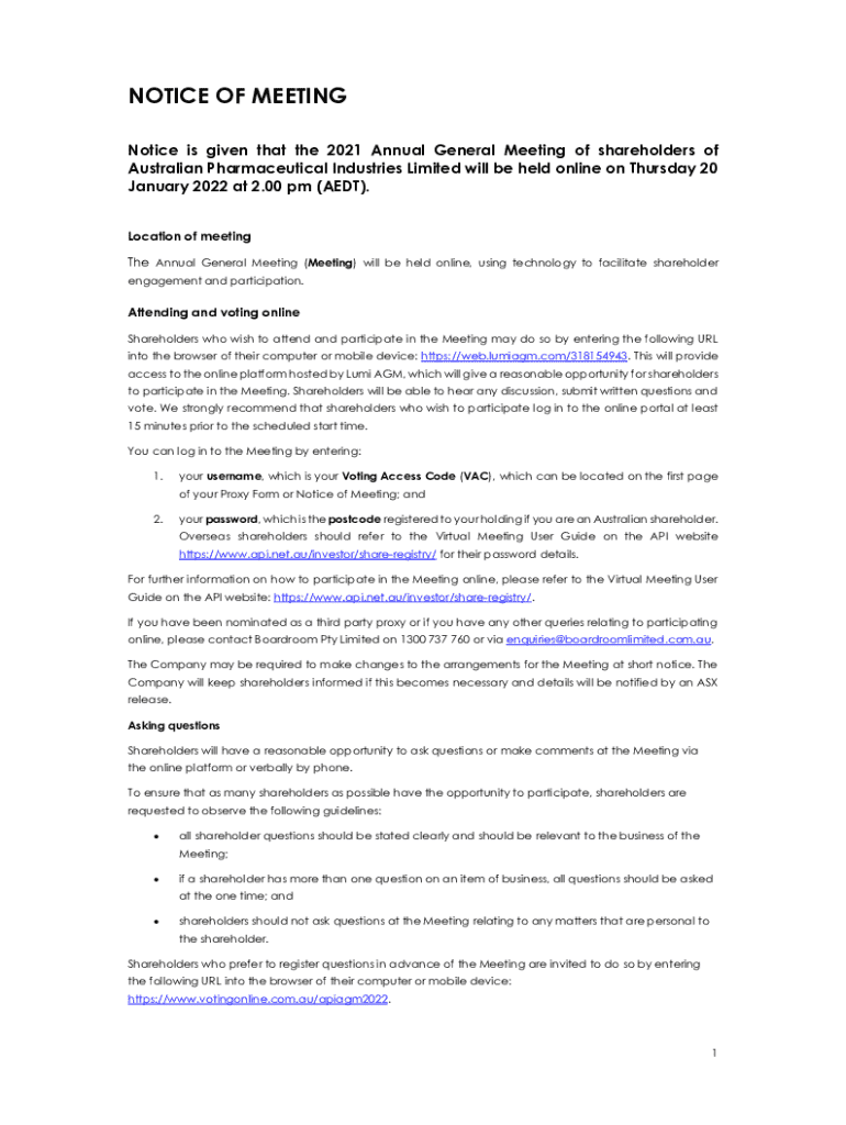 NOTICE OF MEETING Notice is given that the 2021 Annual General Meeting of shareholders of Australian Pharmaceutical Industries Limited will be held online on Thursday 20 January 2022 at 2.00 pm (AEDT).