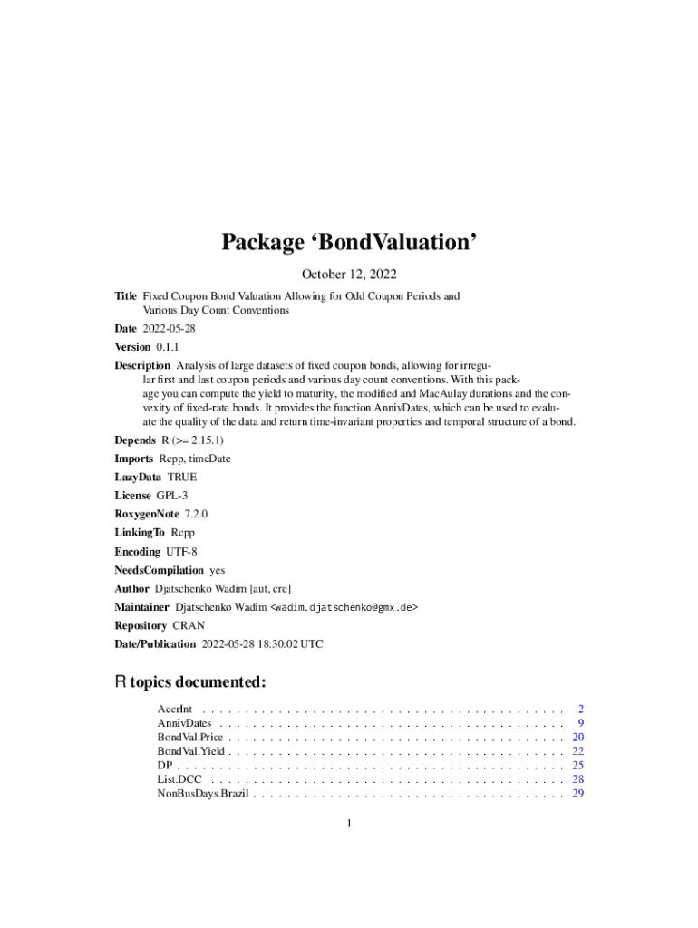 Package BondValuation October 12, 2022 Title Fixed Coupon Bond Valuation Allowing for Odd Coupon Periods and Various Day Count Conventions Date 20220528 Version 0.1.1 Description Analysis of large
