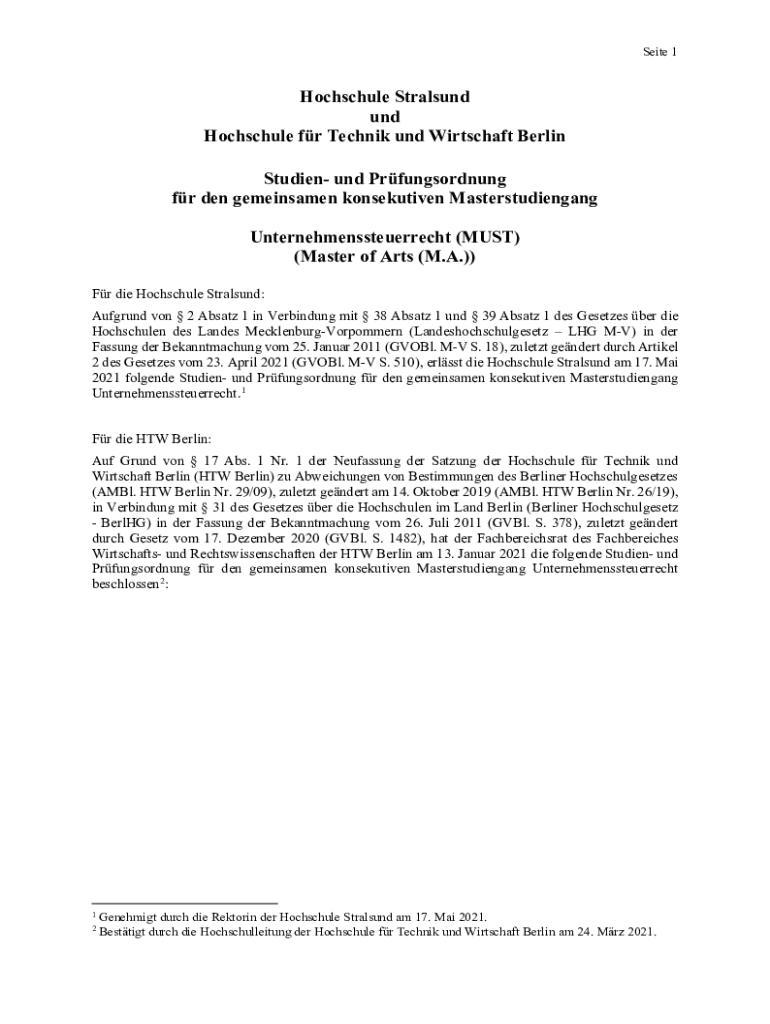 Sate 1Hochschule Stralsund UND Hochschule for Technic UND Airshaft Berlin Studied UND Prfungsordnung for den gemeinsamen consecutive Masterstudiengang Unternehmenssteuerrecht (MUST) (Master of Arts