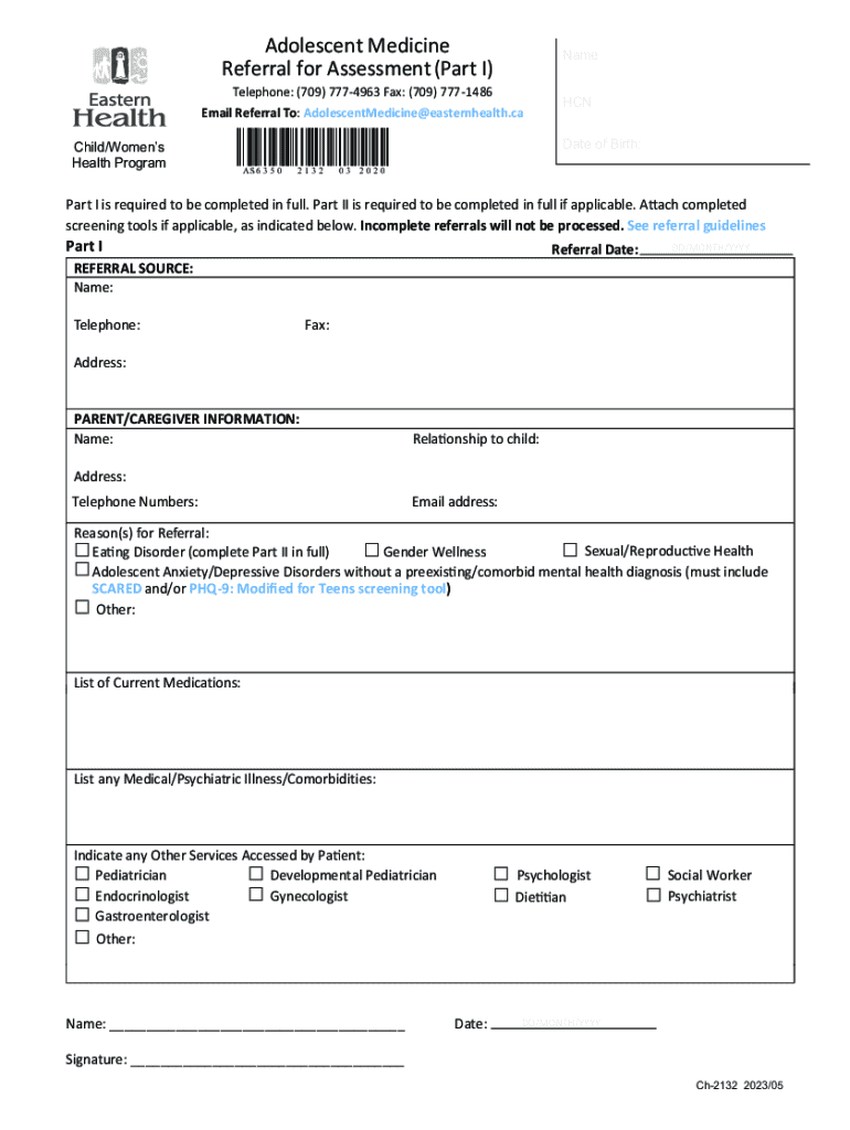 Adolescent Medicine Referral for Assessment (Part I)NameTelephone: (709) 7774963 Fax: (709) 7771486 Email Referral To: AdolescentMedicine@easternhealth.caChild/Women's Health Program Date of Birth:AS