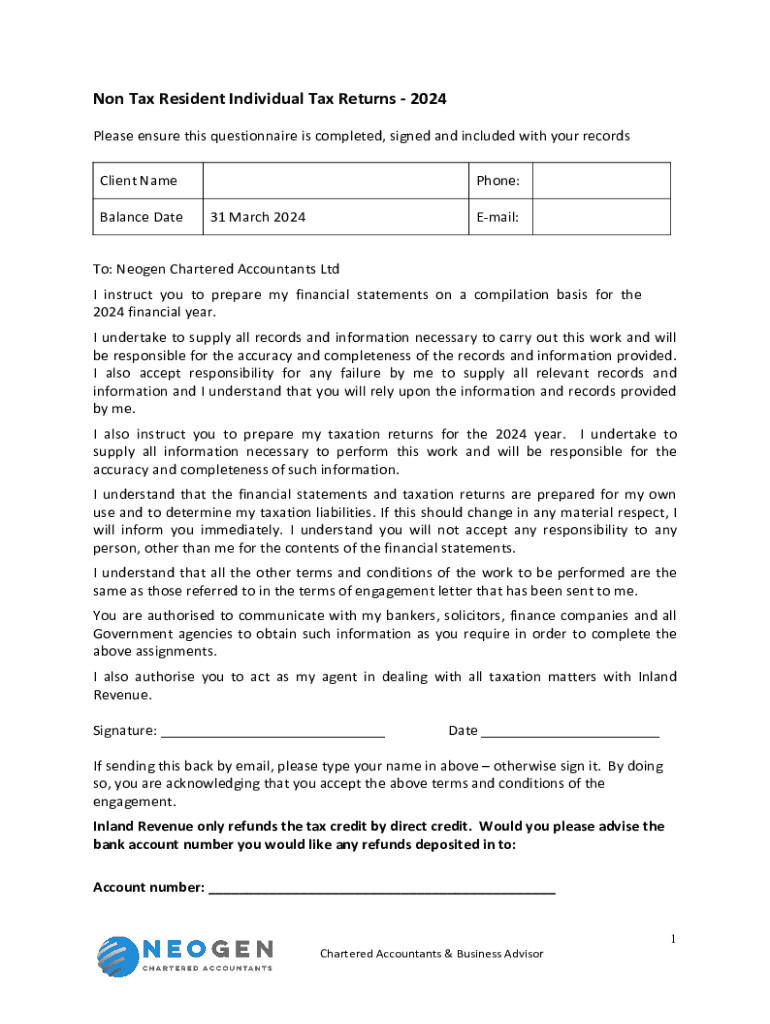 Non Tax Resident Individual Tax Returns 2024 Please ensure this questionnaire is completed, signed and included with your records Client Name Balance Telephone: 31 March 2024Email:To: Neogene Chartered