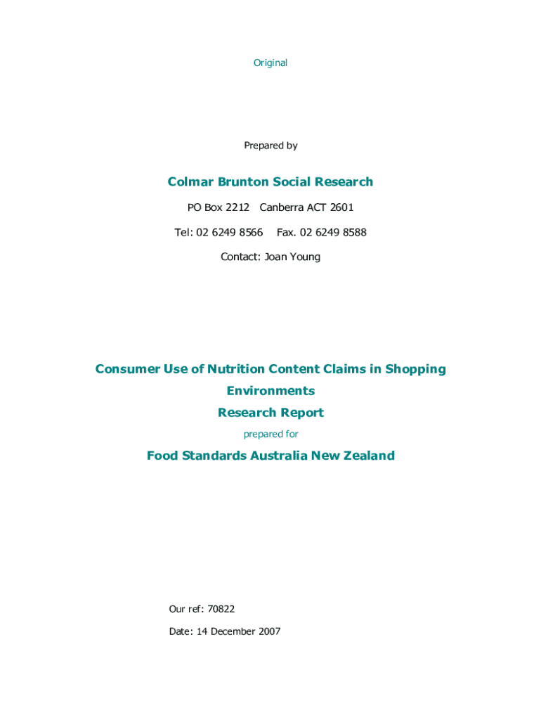 Tel: 02 6249 8566Fax. 02 6249 8588Contact: Joan YoungConsumer Use of Nutrition Content Claims in Shopping