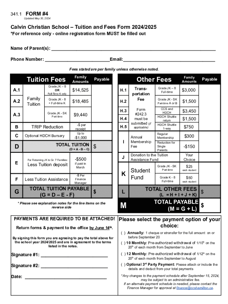 Updated May 30, 2024Calvin Christian School Tuition and Fees Form 2024/2025
