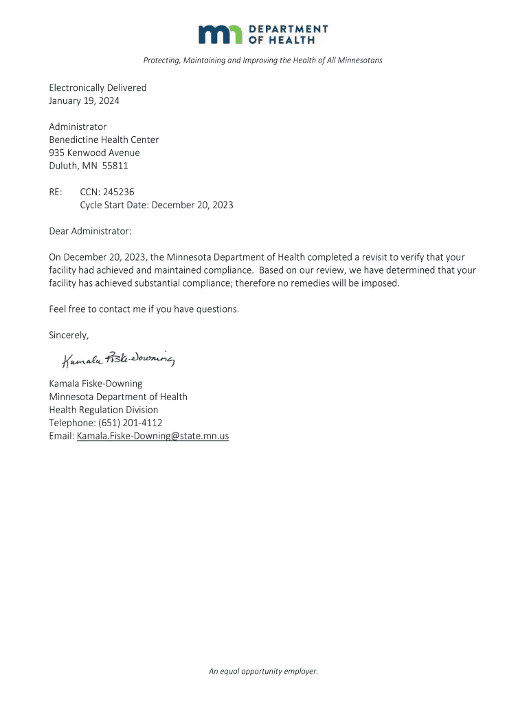This report outlines the compliance status of Benedictine Health Center following inspections conducted by the Minnesota Department of Health in December 2023 and January 2024.