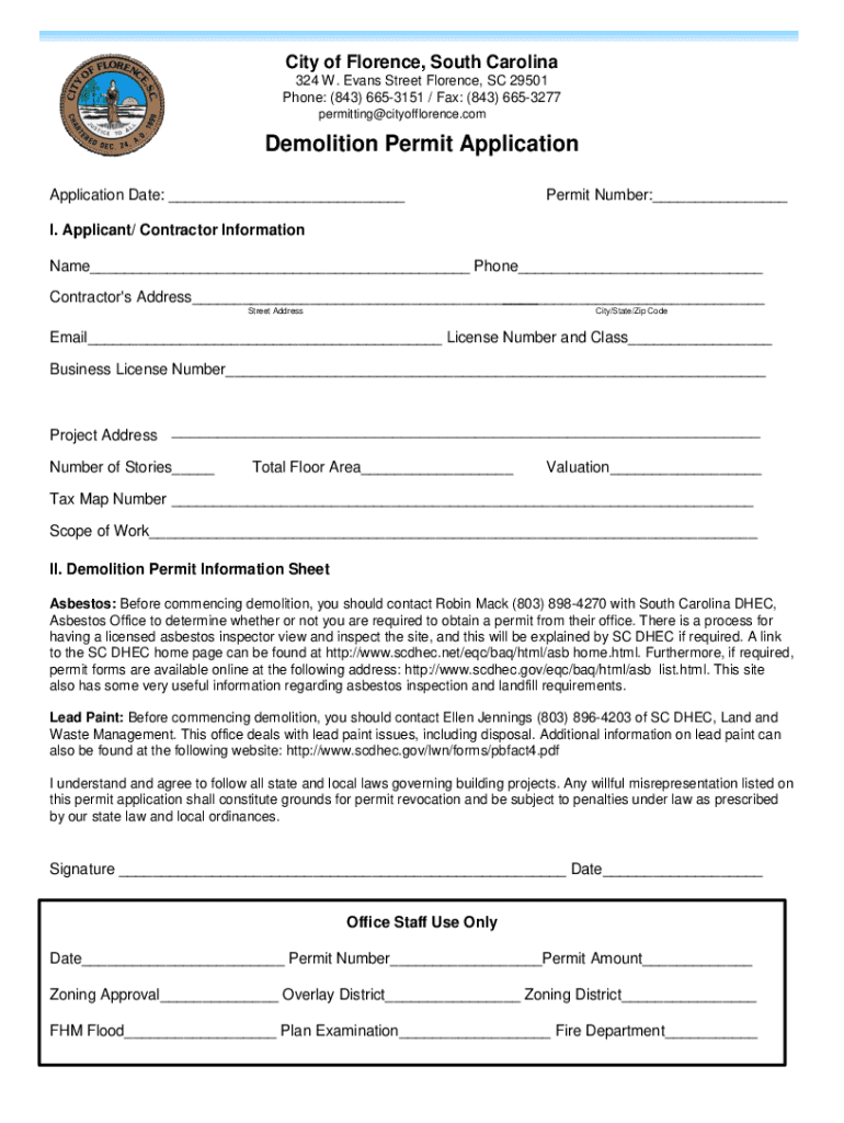 permitting@cityofflorence.comDemolition Permit Application Date: ___Permit Number:___I.