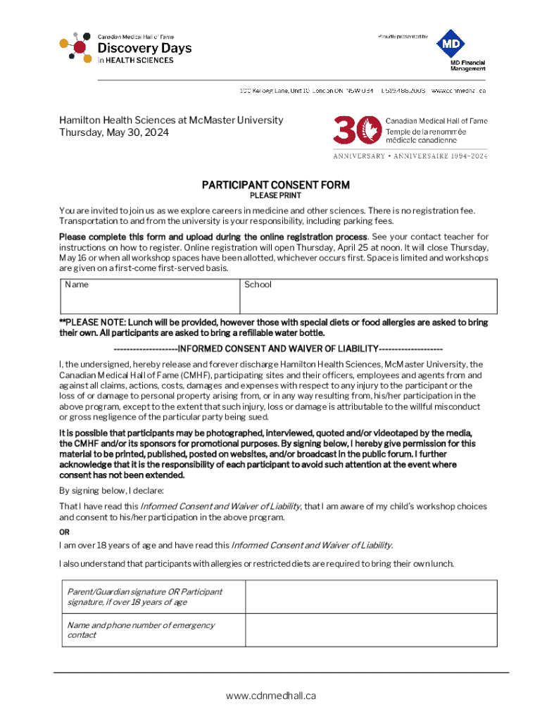 Hamilton Health Sciences at McMaster University Thursday, May 30, 2024PARTICIPANT CONSENT FORM PLEASE Printout are invited to join us as we explore careers in medicine and other sciences. There is