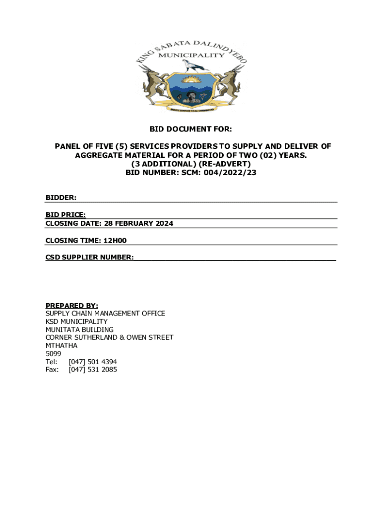 BID DOCUMENT FOR: PANEL OF FIVE (5) SERVICES PROVIDERS TO SUPPLY AND DELIVER OF AGGREGATE MATERIAL FOR A PERIOD OF TWO (02) YEARS. (3 ADDITIONAL) (READVERT) BID NUMBER: SCM: 004/2022/23 BIDDER: BID