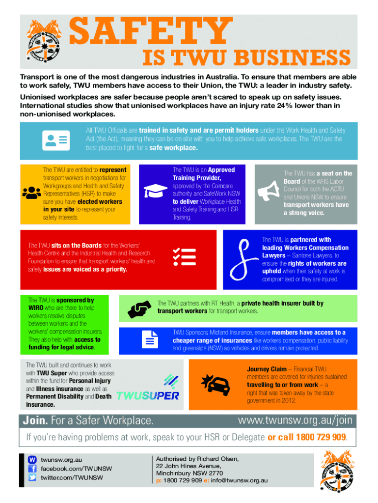 SAFETY IS TWU BUSINESSTransport is one of the most dangerous industries in Australia. To ensure that members are able to work safely, TWU members have access to their Union, the TWU: a leader in industry