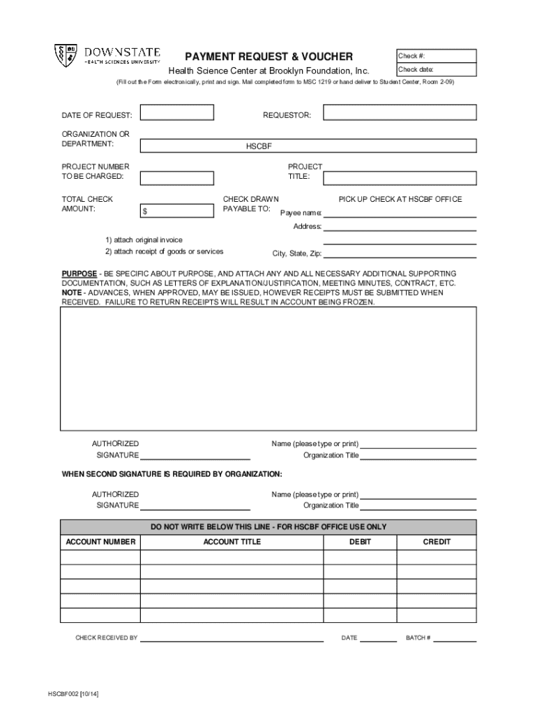PAYMENT REQUEST & VOUCHER Health Science Center at Brooklyn Foundation, Inc. Check #: Check date:(Fill out the Form electronically, print and sign. Mail completed form to MSC 1219 or hand deliver