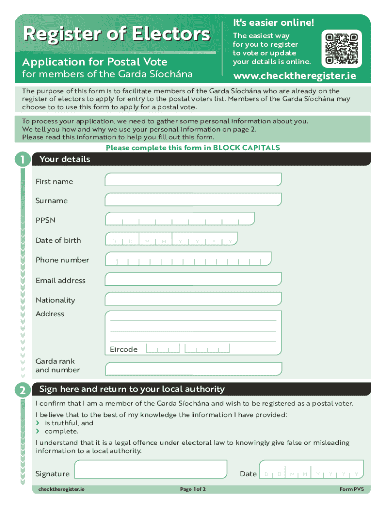 It\'s easier online!Register of ElectorsThe easiest way for you to register to vote or update your details is online.Application for Postal Votefor members of the Garda Sochnawww.checktheregister.ieThe