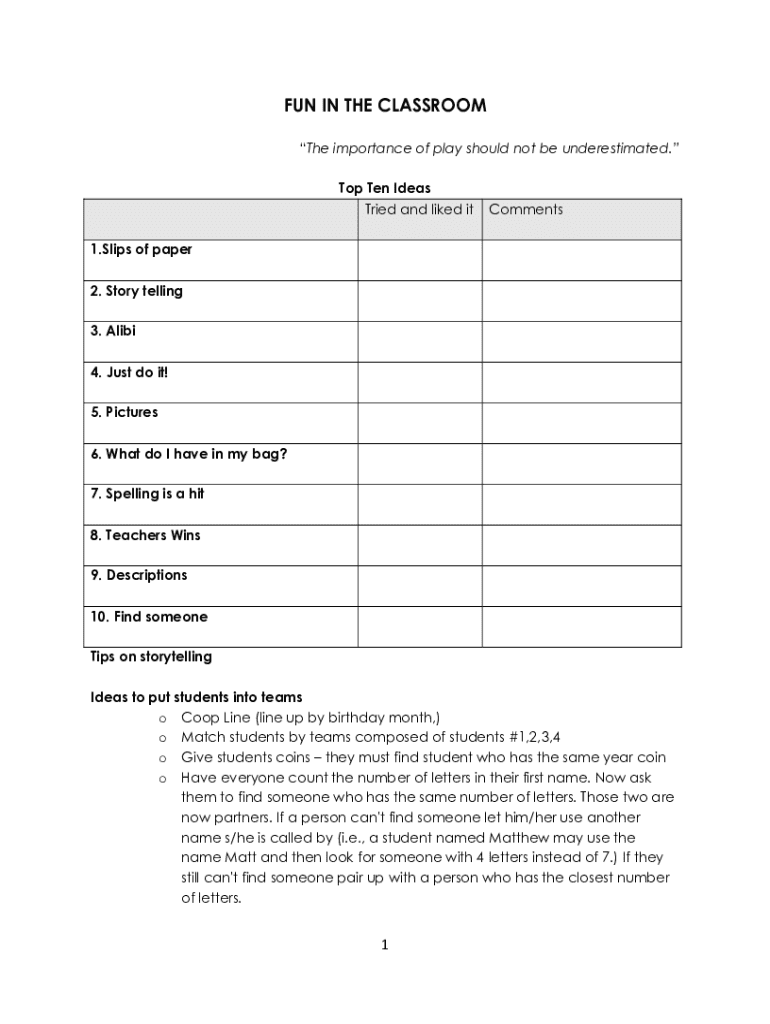 FUN IN THE CLASSROOM The importance of play should not be underestimated. Top Ten Ideas Tried and liked itComments1. Slips of paper 2. Story telling 3. Alibi 4. Just do it! 5. Pictures 6. What do