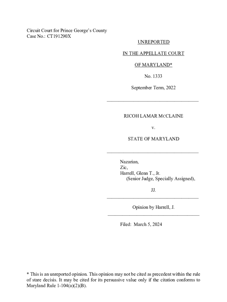 Circuit Court for Prince Georges County Case No.: CT191290XUNREPORTED IN THE APPELLATE COURT OF MARYLAND* No. 1333 September Term, 2022___ RICOH LAMAR McClain v. STATE OF MARYLAND ___ Bavarian, Sic,
