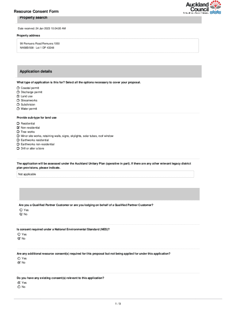 Resource Consent Form Property search Date received: 24 Jan 2023 10:04:00 AMProperty address 99 Remuera Road Remuera 1050 NA58B/938 Lot 1 DP 43248Application details What type of application is this