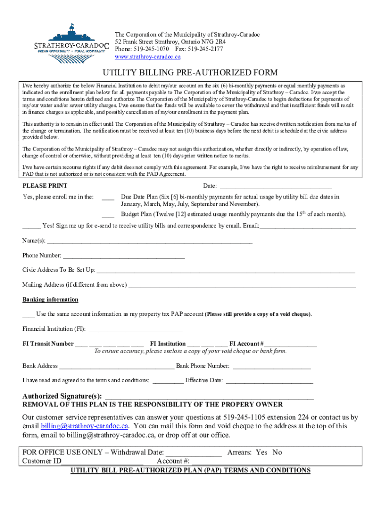 The utility billing pre-authorized form is a document that allows customers to authorize their utility provider to automatically withdraw payments from their bank account for utility services.
