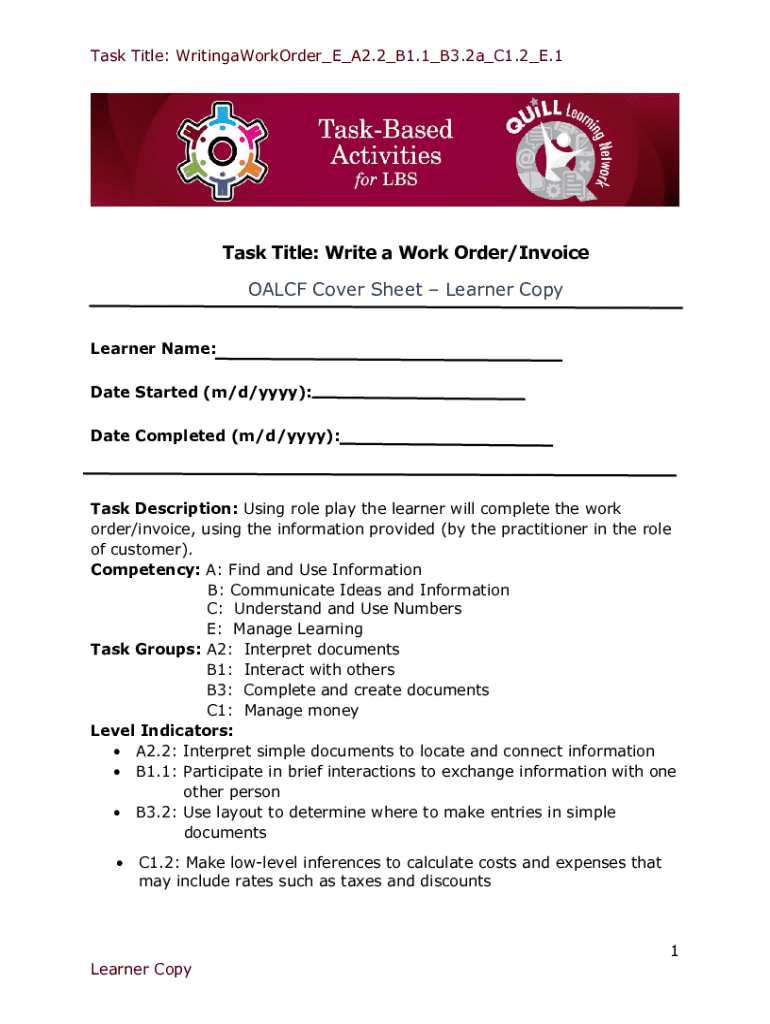 Task Title: WritingaWorkOrder_E_A2.2_B1.1_B3.2a_C1.2_E.1Task Title: Write a Work Order/Invoice OAL CF Cover Sheet Learner Copy Learner Name: Date Started (m/d/YYY): Date Completed (m/d/YYY):Task Description: