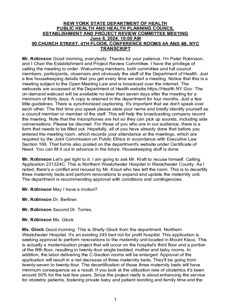 Transcript of the June 6, 2024, meeting by NYS Department of Health discussing health projects, including hospital applications and expansions, emphasizing public health policies.