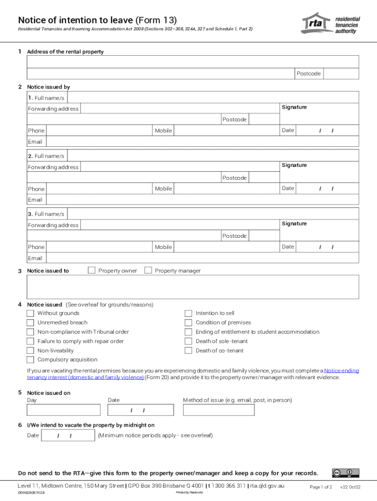 Notice of intention to leave (Form 13) Residential Tenancies and Rooming Accommodation Act 2008 (Sections 302308, 324A, 327 and Schedule 1, Part 2)1 Address of the rental propertyPostcode2 Notice