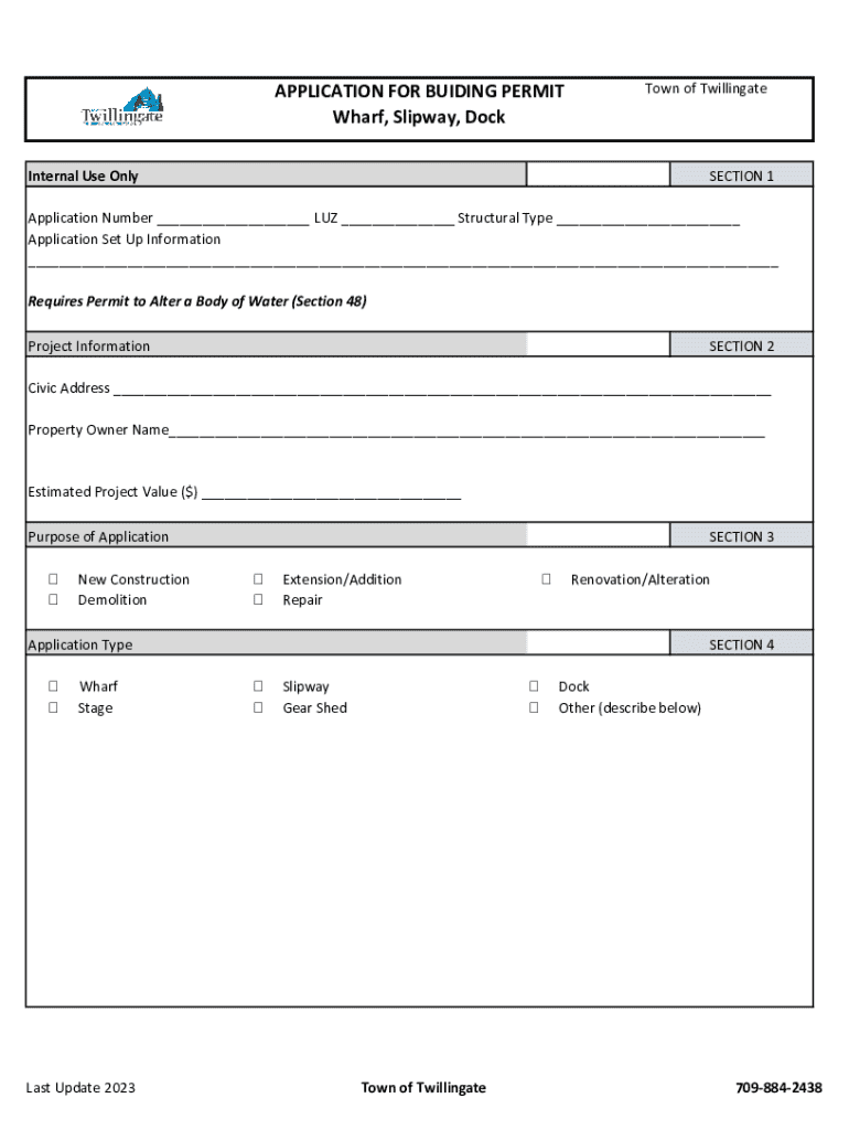 Complete the Building Permit Application for Wharf, Slipway, or Dock in Twillingate. Ensure compliance with all regulations and submit necessary information.