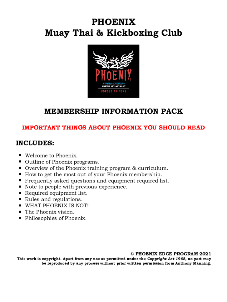 PHOENIX Muay Thai & Kickboxing ClubMEMBERSHIP INFORMATION PACK IMPORTANT THINGS ABOUT PHOENIX YOU SHOULD READINCLUDES: Welcome to Phoenix. Outline of Phoenix programs. Overview of the Phoenix training
