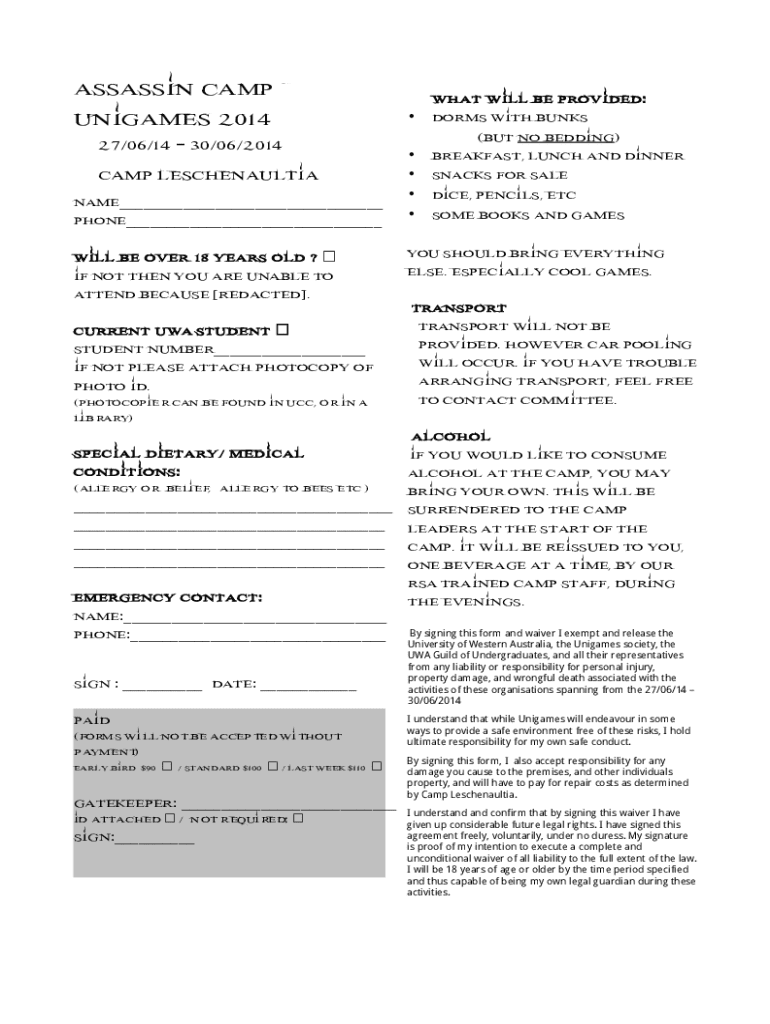 Fill out your assassin camp registration online with pdfFiller!