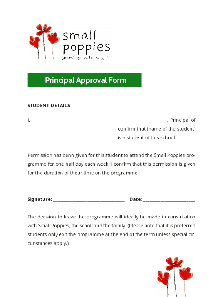 Principal Approval Form STUDENT DETAILS I, ___, Principal of ___confirm that (name of the student) ___is a student of this school. Permission has benn given for this student to attend the Small Poppies