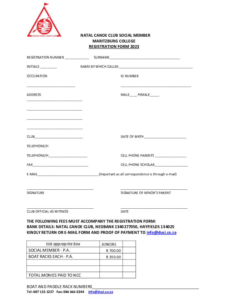 Register for the Natal Canoe Club Social Membership 2023. Fill out the form with personal details and fees. Join us for an exciting canoeing experience!