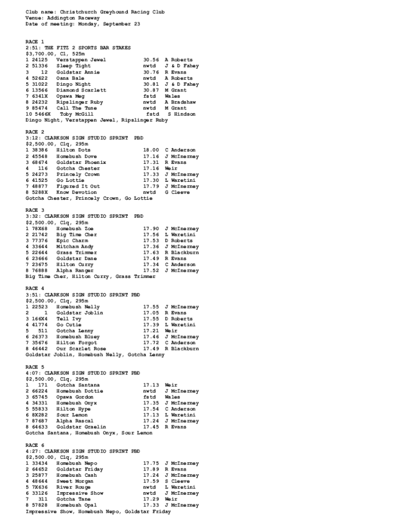 Details of the Christchurch Greyhound Racing Club meeting at Addington Raceway on September 23, 2023, including race information and results.