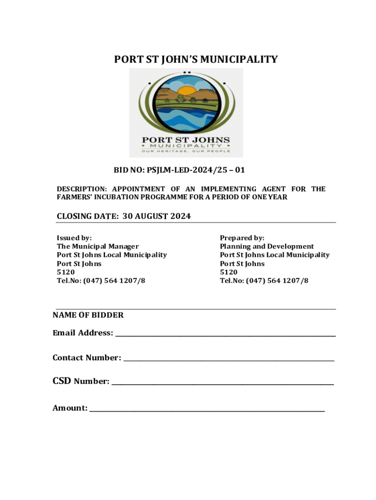 PORT ST JOHNS MUNICIPALITYBID NO: PSJLMLED2024/25 01 DESCRIPTION: APPOINTMENT OF AN IMPLEMENTING AGENT FOR THE FARMERS INCUBATION PROGRAMME FOR A PERIOD OF ONE YEARCLOSING DATE: 30 AUGUST 2024 Issued