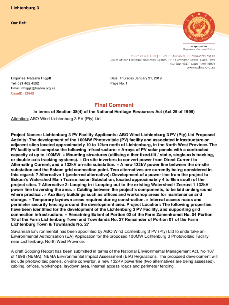 This document provides details about the Environmental Authorisation for the 100MW Lichtenburg 3 Photovoltaic Facility, including heritage assessments and project specifications.