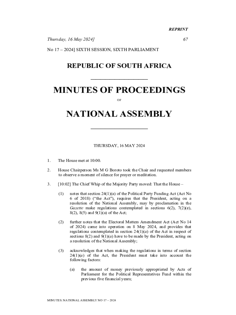 REPRINT Thursday, 16 May 2024]67No 17 2024] SIXTH SESSION, SIXTH PARLIAMENTREPUBLIC OF SOUTH AFRICA___ MINUTES OF PROCEEDINGS NATIONAL ASSEMBLY ___ THURSDAY, 16 MAY 2024 1. The House met at 10:00.2.