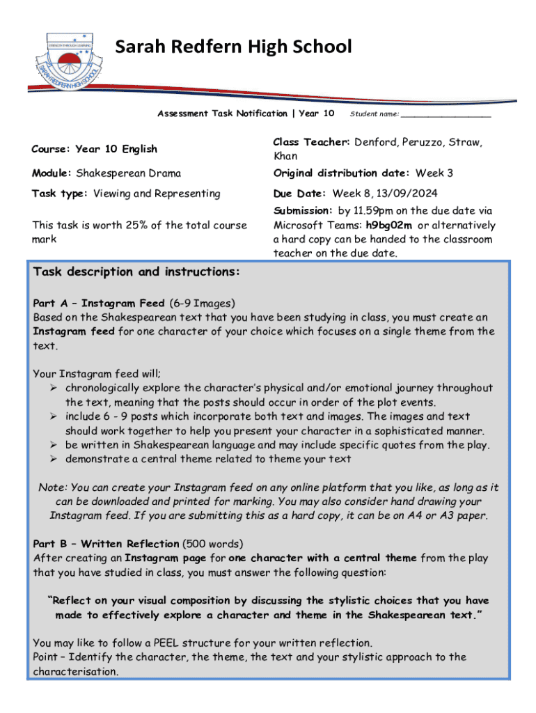 Engage in Year 10 English with this assessment task focused on Shakespearean Drama. Create an Instagram feed and reflection exploring character themes. Due September 13, 2024.