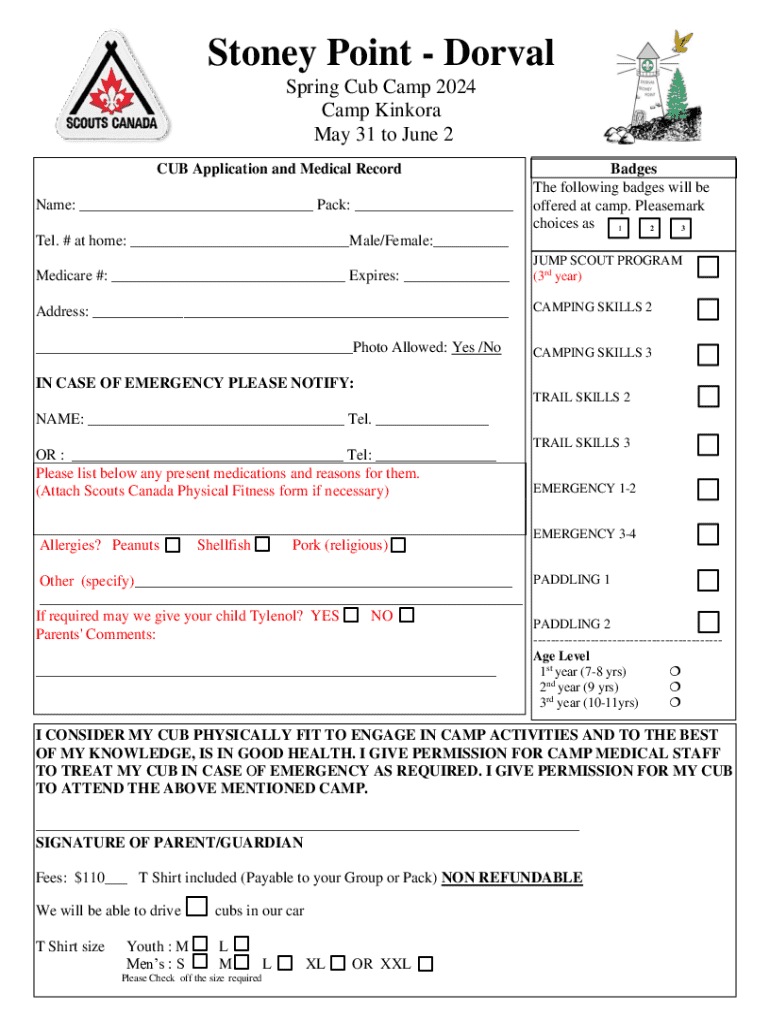 Stone Point Dorsal Spring Cub Camp 2024 Camp Kinko May 31 to June 2 CUB Application and Medical Record Name: ___ Pack: ___Badges The following badges will be offered at camp. Please mark choices as
