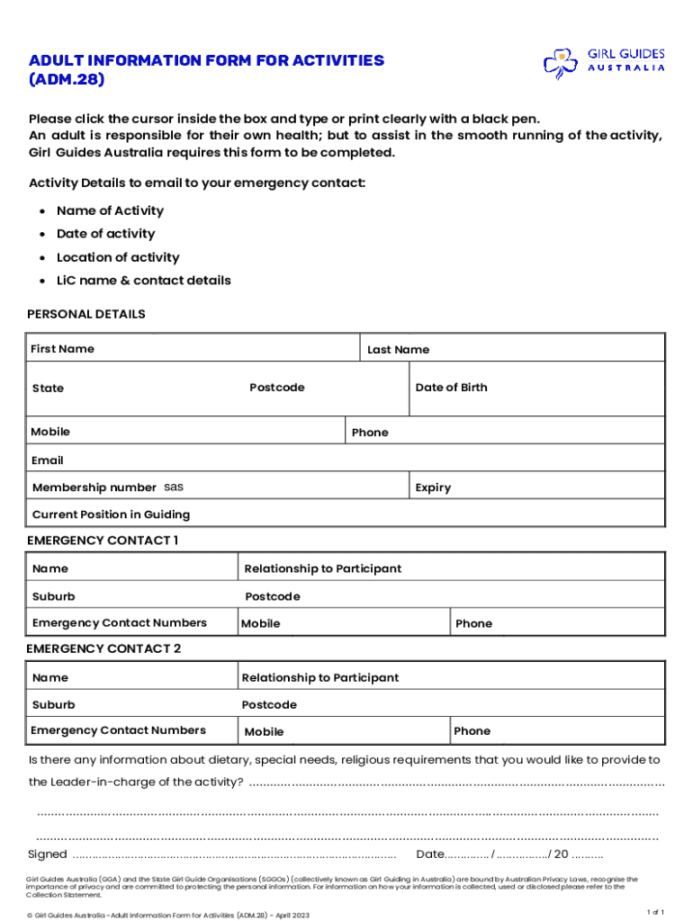 ADULT INFORMATION FORM FOR ACTIVITIES (ADM.28) Please click the cursor inside the box and type or print clearly with a black pen. An adult is responsible for their own health; but to assist in the